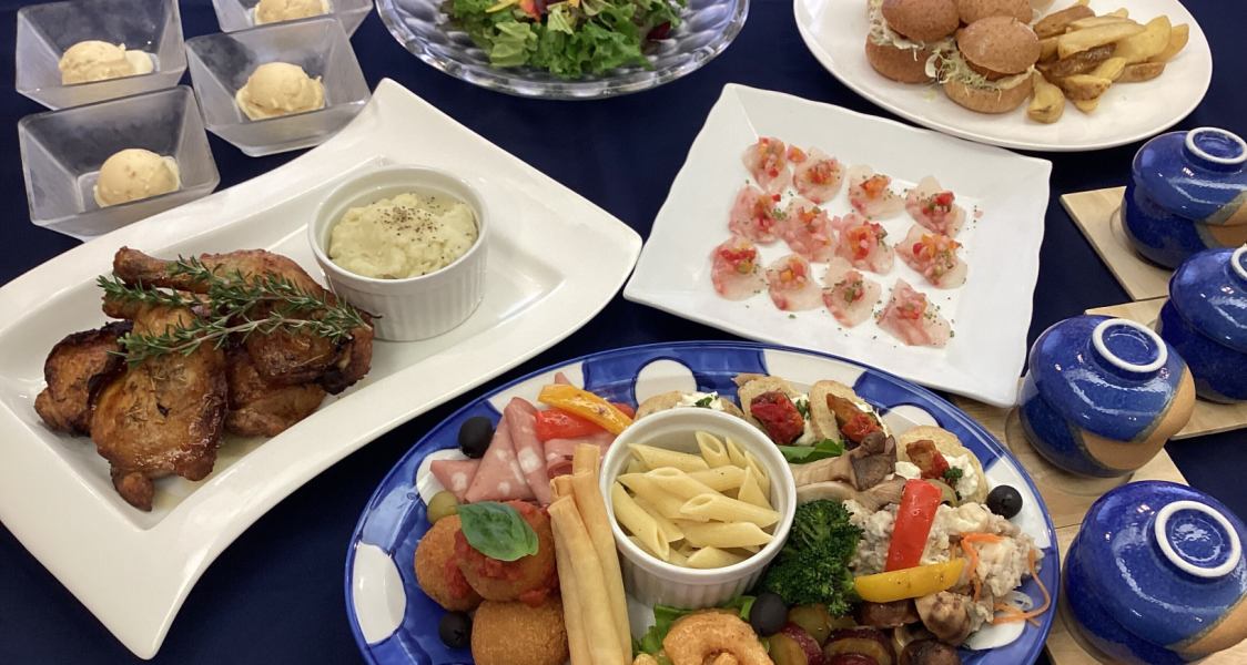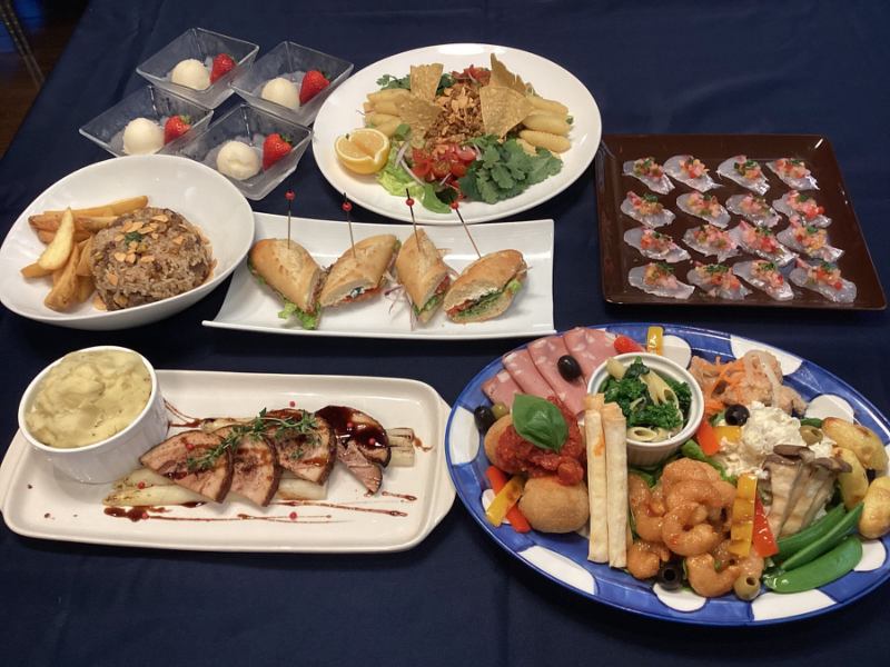 一例 | 生ハム / 海老チリ/牛焼きしゃぶ/ レバーペースト/海老のエスカベッシュ/鳥の唐揚げ/海鮮揚げ春巻き/テリーヌ / ミニバーガー/焼そば / パスタ 2種/ ピザ / 焼き鳥 /つくね/ 寿司4種 / フルーツ2種 / ケーキ2種 /等 |